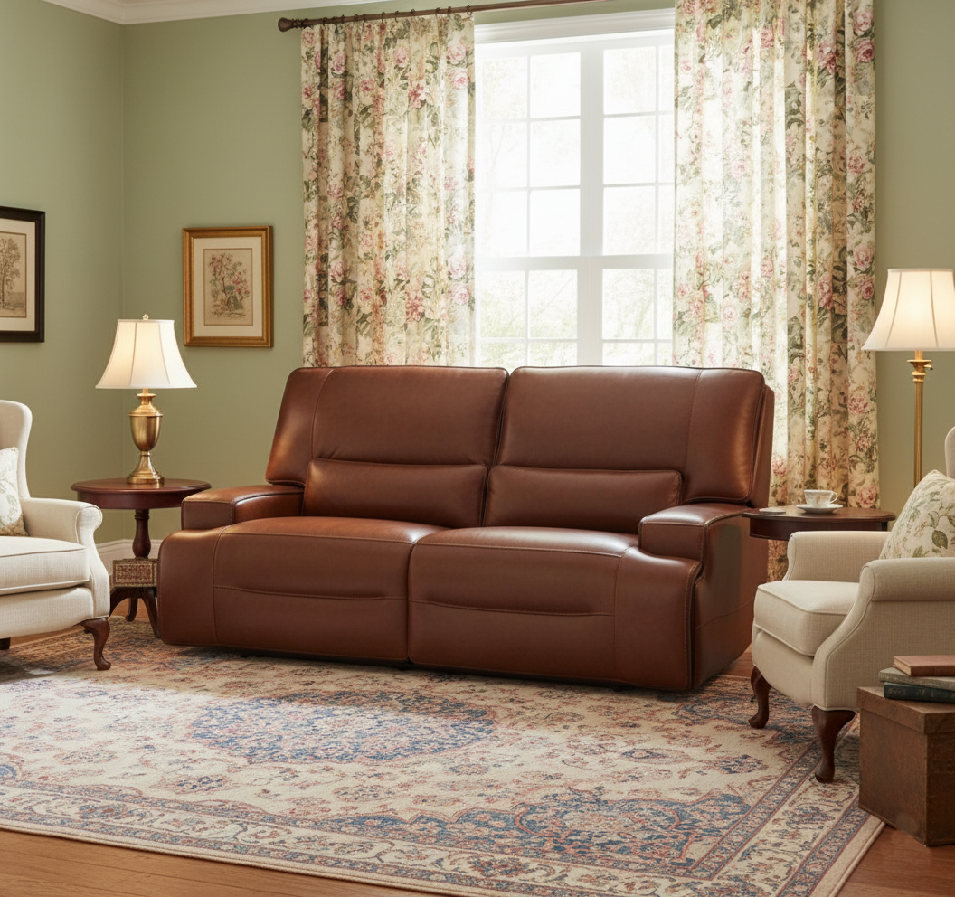 Experience the ultimate in comfort and convenience with the Texas Range recliner. Crafted with tan leather, this recliner features electric reclining and an adjustable back for customized comfort. The sleek black trim adds a touch of elegance to the plush, oversized design. Upgrade your relaxation game with Texas Range.